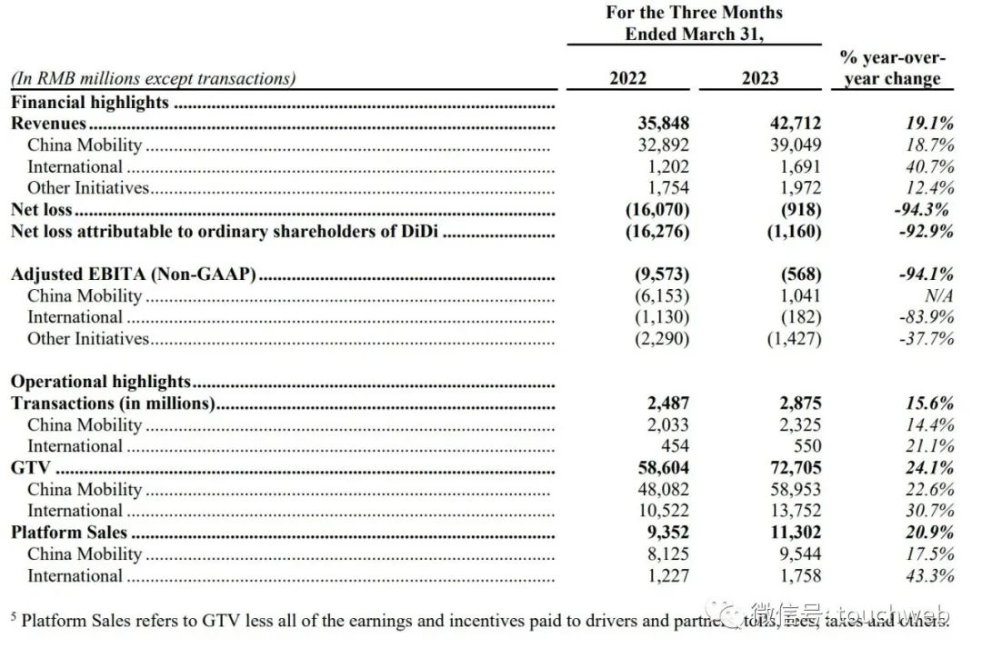 2023年一季度滴滴核心平台总交易额(GTV)达到727.1亿元,同比增长24.1%。其中,中国出行业务GTV达到589.5亿元,同比增长22.6%;国际化业务GTV达到137.5亿元,同比增长30.7%。