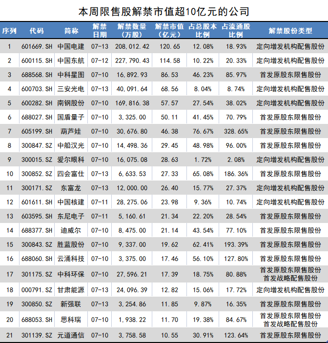电建龙头中国电建是本周限售股解禁规模最大的公司。根据公告,公司7月13日有20.80亿股定增限售股上市流通,占总股本比例12.08%,约合解禁市值120.65亿元。