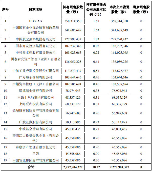 公告显示,中国东航7月12日有22.78亿股定增限售股解禁,占总股本比例的10.22%,约合解禁市值114.58亿元。公司此次解禁股东共19位,持股比例超过1%的有UBS AG、中国国有企业混改基金和中国航空油料集团有限公司。