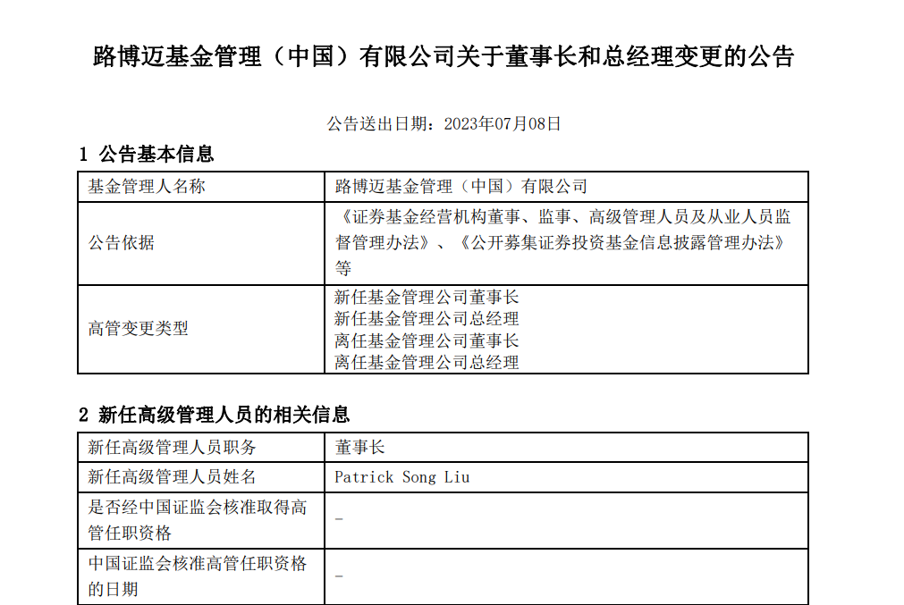7月8日,路博迈基金发布公告称,原总经理刘颂因工作需要不再担任总经理职务,新任公司董事长一职;而原董事长阎小庆因工作需要不再担任董事长职务,新任公司总经理一职。这意味着两位高管的职位发生了调换。