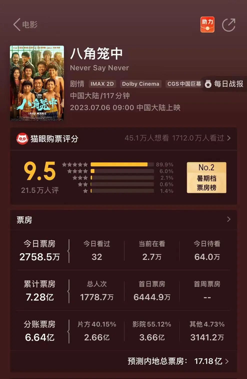 在《八角笼中》影片质量得到肯定之后,电影票房一路走高,先是在周六和周日连续2天登顶单日票房冠军,猫眼专业版显示截止7月9日21点票房已经顺利突破8.5亿元,远超上映之初的预期。