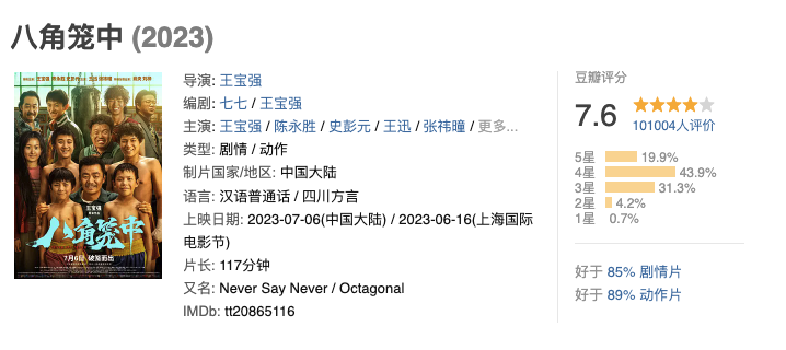 结果当然也不负期待。这部电影在豆瓣的评分达到了7.6分,高于同期上映的其他影片;猫眼和淘票票的评分分别为9.5分和9.4分,也是一个相当不错的评分,说明大众对这部电影的品质是认可的。