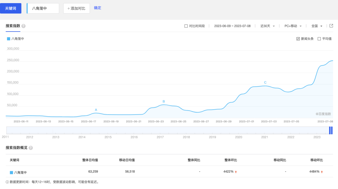 这样的方法是十分奏效的。经过十多天的全量点映,正式上映之前的7月6日,《八角笼中》已经取得了超4亿元的票房;而根据百度指数的数据显示,关键词“八角笼中”从6月22日电影开始的热度趋势呈现阶梯式上升,一波高过一波,显示了电影口碑发酵带来的全民热度,为影片的出圈讨论奠定了基础。