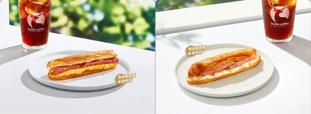 日前,瑞幸咖啡在其小程序上新两款植物肉三明治,分别为「奶香火腿风味三明治」和「蛋香牛肉风味三明治」,这两款三明治都标明了「甄选星期零植物肉」。