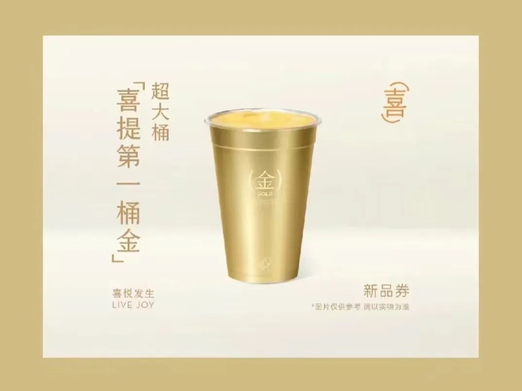 从预告图来看,本次喜茶 x 周大福联名新品以金色、橙色为主色调,并结合两个品牌的特点,打出“喜提第一桶金”“金喜上新”的slogan。(FoodTalks)