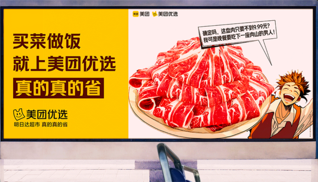 前不久,以美食著称的汕头被一组食欲感超强的漫画攻占,那就是美团优选出街的首个AI作画的户外广告——省钱少女漫系列。这一系列广告,讲述了10组可爱省钱人的脑洞晚餐故事,有能吃下“肉山”的大胃王少年、关心城里葱姜蒜价格的怪兽、在春天爱意萌发的情侣、热血沸腾的少年......