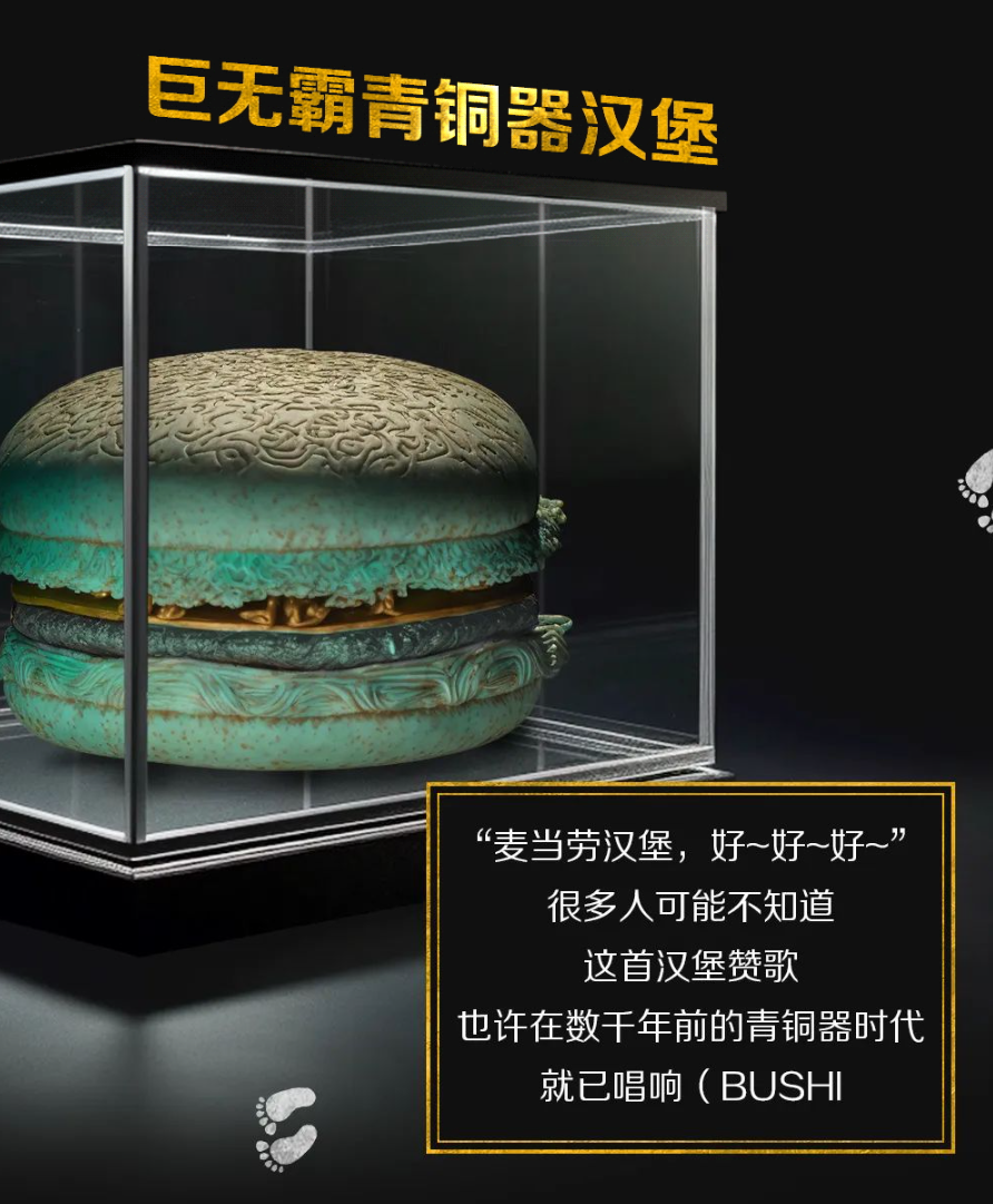 四月,麦当劳在冲浪月刊上展示了由AI制作的千年前的麦麦宝藏,巨无霸青铜器汉堡、传世宝玉薯条、青花瓷可乐、亮晶晶薯饼、白玛瑙黄金麦乐鸡、黄金麦辣鸡翅......以AI为工具手实现古老文物和现代快餐碰撞,让麦当劳的前世今生得以展现,麦麦博物馆里的每一件“古董”都让麦门信众们直呼“麦门永存”。