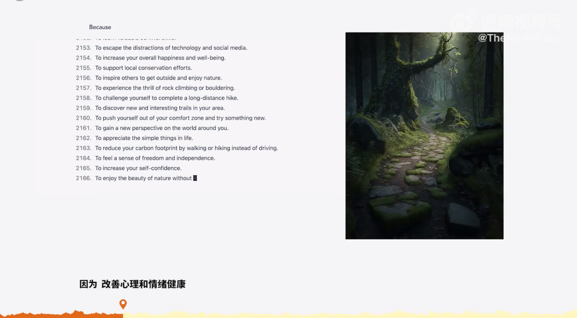 The North Face向AI发问,重回山野的10000个理由是什么,并记录下ChatGPT回答全过程。ChatGPT能给出一万个理由,而热爱山野的你永远能给出第10001个理由,登山涉水,步履不止,只为响应巍峨群山的召唤。同时还在Midjourney的帮助下,延展出#10000个重回山野的理由#系列海报。