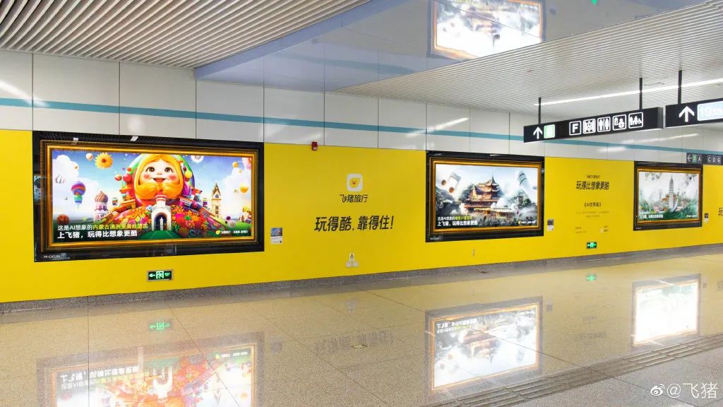 广告投放至城市地铁站,一经公开后立刻引发讨论,微博#飞猪AI广告引发热议#阅读量突破1.4亿。飞猪的这组AI广告海报首先用颜色的明亮和风格的奇妙吸引了注意,同时还尽量还原城市和景区的特色,也是一次有趣的尝试,但在协调产品、品牌表达和AI三者的关系还需再精进。