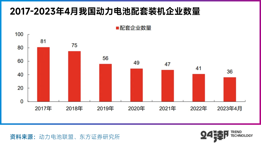 据东方证券统计,仅过去五年我国动力电池行业在经历大洗牌后,能够配套车型的电池生产企业数量已经从2017年的81家降至36家(2023年4月),降幅达55.56%。