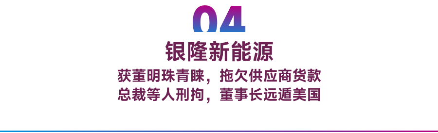 2018年11月份,大股东银隆集团以及银隆集团实际控股人魏银仓、前高管孙国华涉嫌侵占公司利益超10亿元。2019年4月,银隆官微发布声明,该公司董事、原公司总裁孙国华在内等六人已被刑拘,涉及侵占公司利益总计超过14亿。原董事长兼大股东魏银仓远遁美国。
