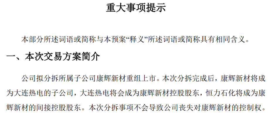 千亿民营石化巨头拟分拆康辉新材与大连热电重组上市。