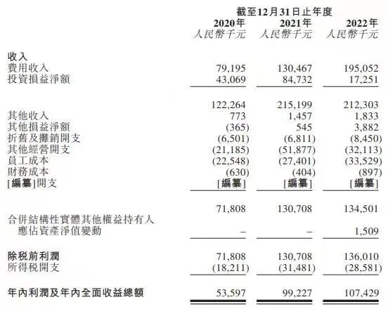 博将资本的收入主要来自于基金管理业务所得的费用收入、以自有资金投资于在管基金所获得的投资收益。2020年至2022年,博将资本的总收入分别约为人民币 1.22 亿元、2.15 亿元及 2.12 亿元,年内利润分别约为人民币 5359.7 万元、9922.7 万元及 1.07 亿元。