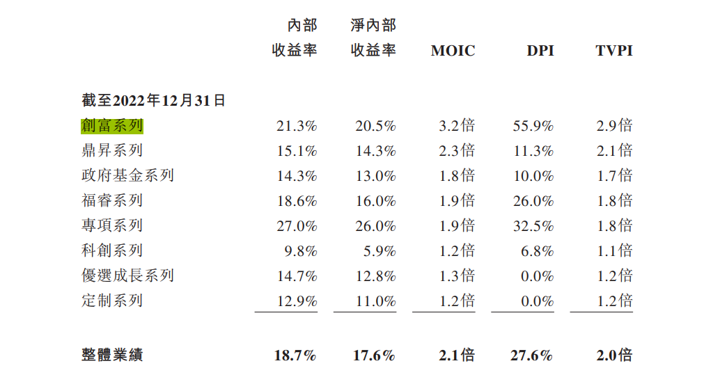 不过,在基金业绩方面,根据招股书显示,截至2022年12月31日,博将资本旗下基金实现18.7%的整体内部收益率。但值得注意的是,招股书披露的8 只基金尚无一只实现DPI(实收资本配比)回1,其中,创富系列DPI最高,为0.559倍,也未能破1倍,意味着LP至今未收回成本。