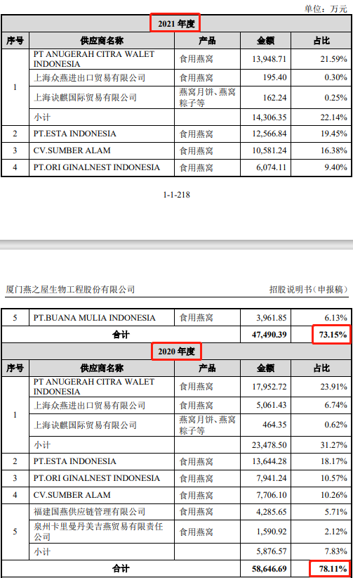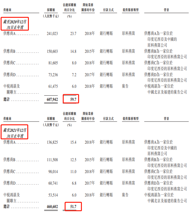 另外,港股招股书中,第五大供应商为一家广告公司,提供服务类型为“广告”,并非“原料燕窝”。