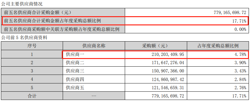 而提交港交所的聆讯资料显示,2020年和2021年,公司自五大供货商的采购量分别占公司总采购量的59.7%及51.7%,分别较A股招股书披露内容相差18.41个百分点和21.45个百分点,差异较大。