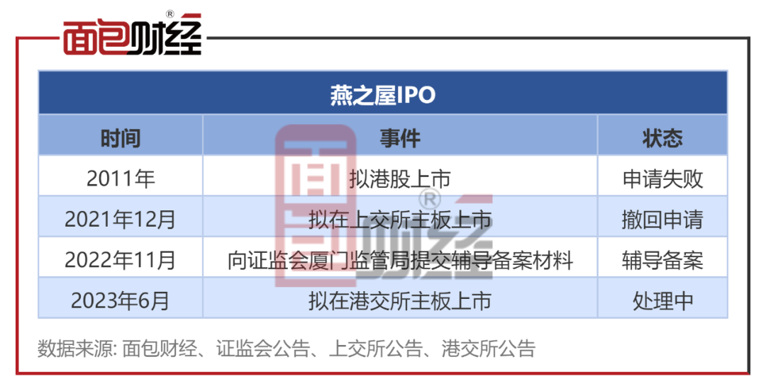 2022年11月,燕之屋决定重启A股上市申请并向证监会厦门监管局提交辅导备案材料,截至2023年5月31日,燕之屋的审核状态为“辅导备案”。2023年6月12日,燕之屋再次向港交所提交上市申请书。