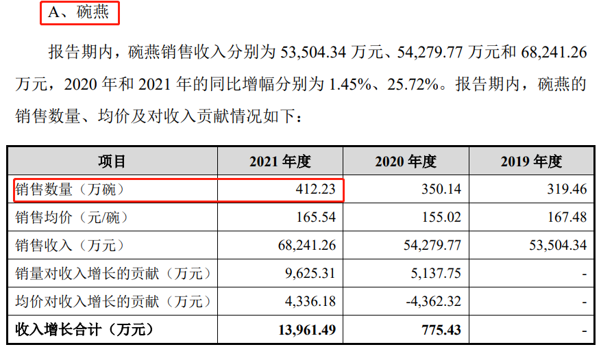 2021年,A股招股书披露的碗燕、鲜炖燕窝销量分别为412.23万碗、811.47万碗;而港股招股书披露的碗燕、鲜炖燕窝销量分别为385.55万碗、811.66万碗,销量分别相差约26.68万碗、0.19万碗。