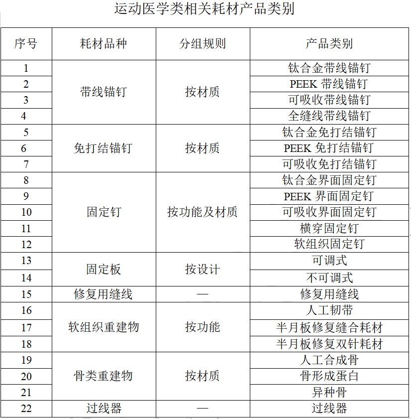 运动医学类相关耗材类别众多,共有22大类耗材品种纳入。