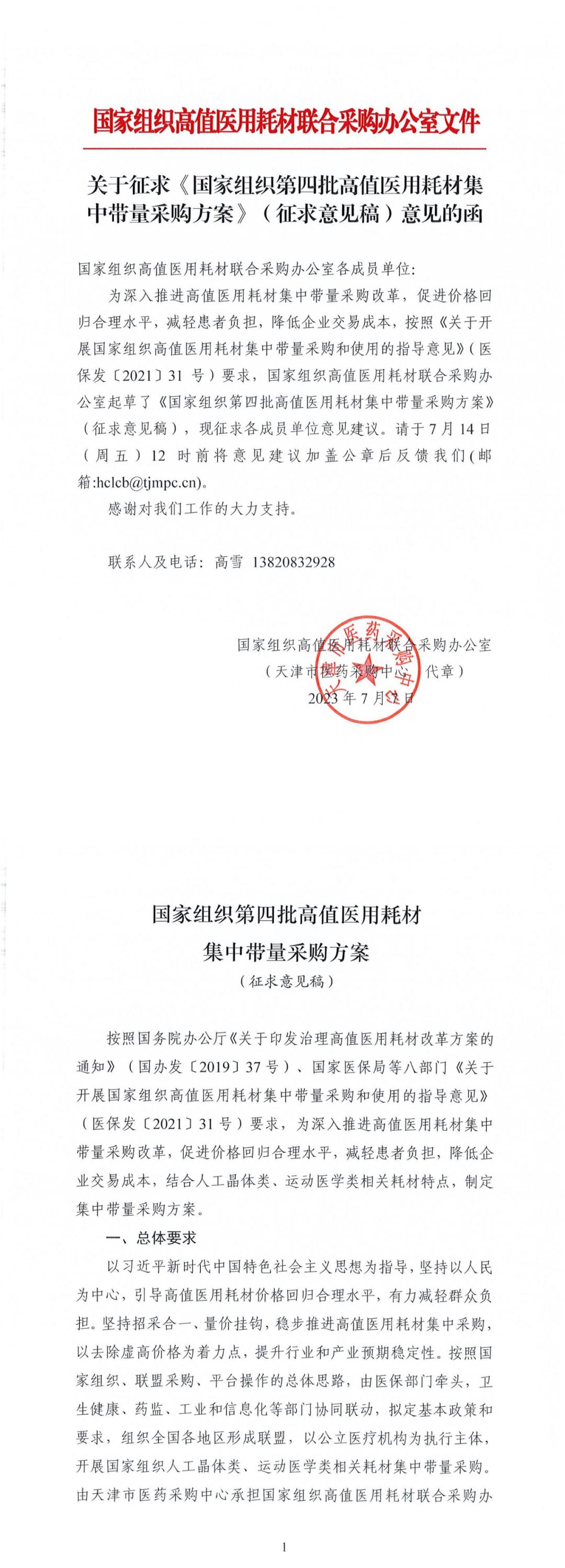 7月7日,《国家组织第四批高值医用耗材集中带量采购方案(征求意见稿)》(以下简称意见稿)流出,第四批耗材国采正式提上日程,眼科(人工晶体)、骨科(运动医学)产品将再次登上国采“竞技场”!