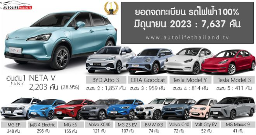 AutoLife的统计数据显示,6月份泰国纯电动车登记量为7637辆。