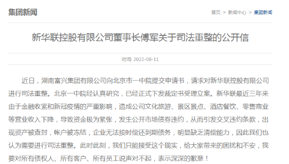 2022年8月9日,新华联控股收到北京市第一中级人民法院《民事裁定书》,裁定受理破产重整申请。两天后,新华联控股董事长傅军发布公开信称,“绝不会逃废债务”。