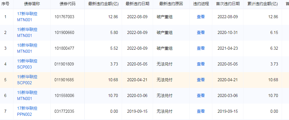 目前,新华联控股共有7只债券违约,违约本金约50.44亿元。其中多只债券如“15新华联控MTN001”、“19新华联控 SCP002”、“19新华联控 SCP003”均从2020年开始违约,至今已经过去约3年半的时间。
