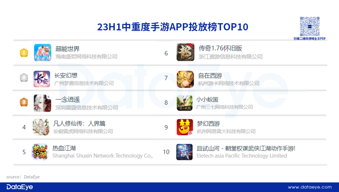 DataEye研究院整理了2023上半年中重度手游APP投放素材数TOP10,具体榜单如下: