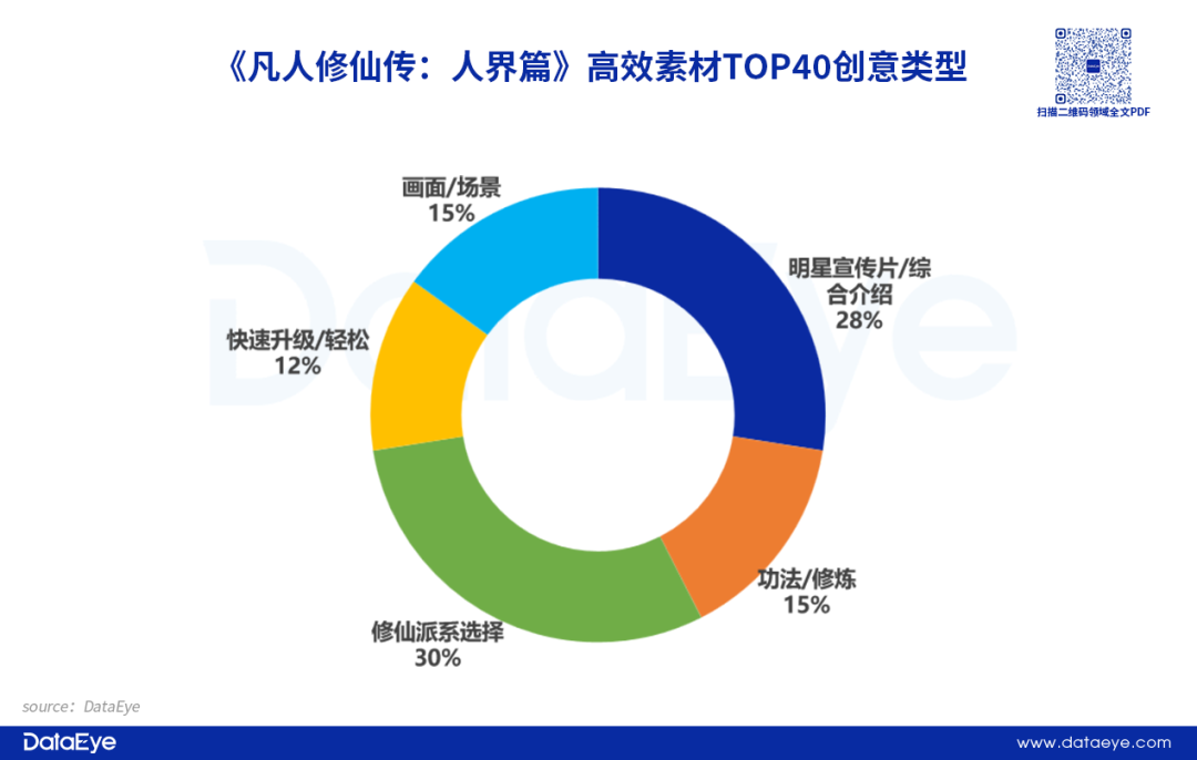 DataEye研究院整理了《凡人修仙传:人界篇》2023上半年手游买量素材计划数TOP40(高效素材)。具体来看,关于修仙派系选择占比为30%,素材通过修仙派系的区别深入有内容,期望吸引到更多题材爱好者。另外,项目组邀请到国际武打巨星李连杰担任品牌代言,尝试通过名人背书的方式,突出产品特点和内容玩法。另外,项目组还会突出快速升级和轻松游戏感。