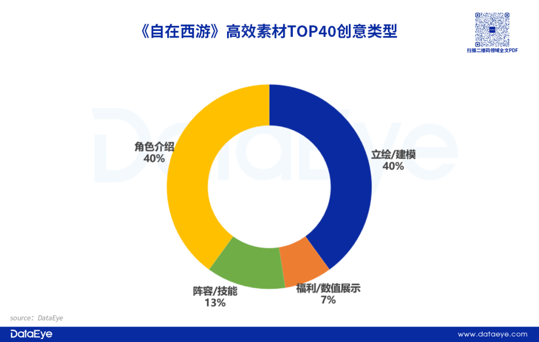 DataEye研究院整理了《自在西游》2023上半年手游买量素材计划数TOP40(高效素材)。具体来看,以角色介绍和人物立绘建模展示为主,项目组通过人物角色进行切入,前者更多是关于角色本身,以讲解的方式提升玩家的认知,更好上手;后者是通过一些动画、小剧场来丰富人物角色,加深玩家影响。另外,素材也有关于阵容&技能搭配等解说向素材,但占比不高。