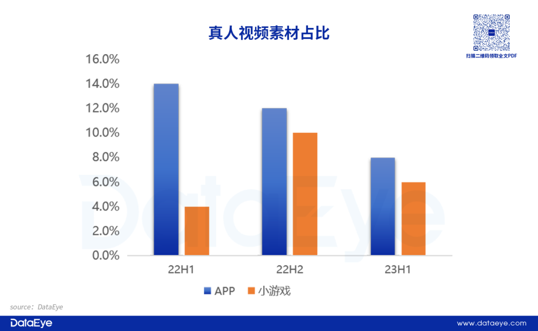 降本增效影响,手游APP真人素材持续下滑。手游APP真人素材占比仅8%,微信小游戏为6%。降本增效的持续影响下,游戏厂商严格控制制作素材的预算,由于真人素材预算往往更高,APP的真人素材因此下滑;厂商更专注低成本素材,或者更具内容性质的真人素材(如短剧)。