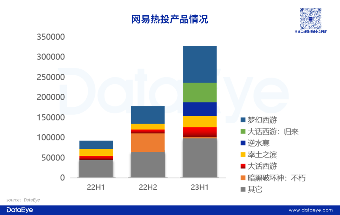 网易23H1投放量明显提升,由于上半年多款新品上线,买量营销变得活跃,其中6月底上线的《逆水寒》,当日投放素材就超过3万组。