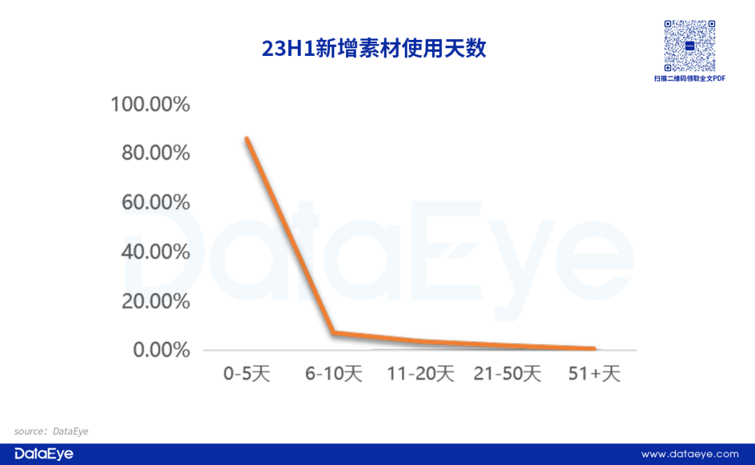 2023上半年新增素材中,单个素材平均使用天数为3.9天,较2022年全年的4.2天略有下滑,同时对比此前的数据也处于较低的水平。累计投放1—5天(含)的占86.1%,超过11天(含)的新增素材,仅占6.6%。换言之,累计投放1—5天(含)的素材占比有所下滑,意味着素材使用效率有所提升,但幅度不大。