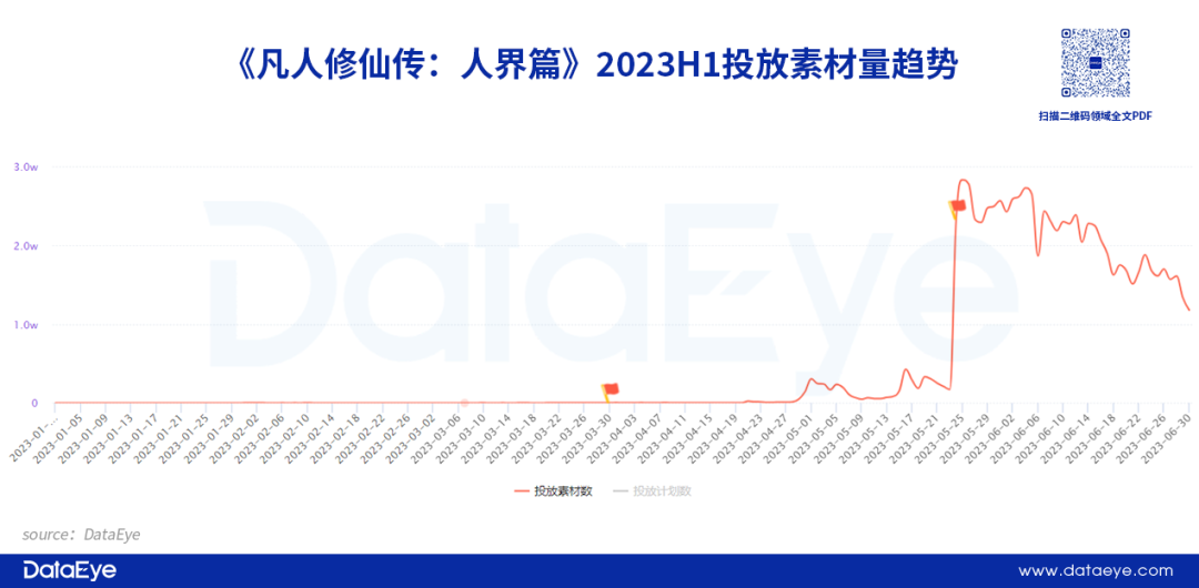 DataEye-ADX投放数据显示,《凡人修仙传:人界篇》于今年5月23日正式上线公测,首发当天买量投放飙升至2.3万组,而后整体投放下滑趋势,但对比市场其他产品,投放量依然强劲。6月末投放量仍保持日均1.3万组素材。