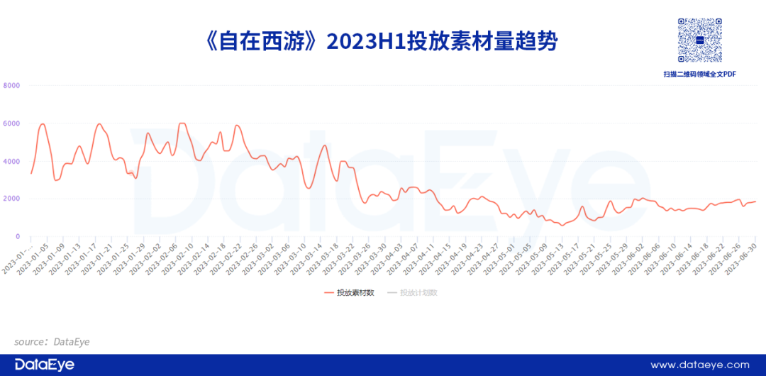 DataEye-ADX投放数据显示,《自在西游》在2022年末上线,产品上线后投放表现整体稳定,单日投放峰值接近6000组素材,今年4月开始整体投放表现有所下滑,基本维持在日均1000组素材。