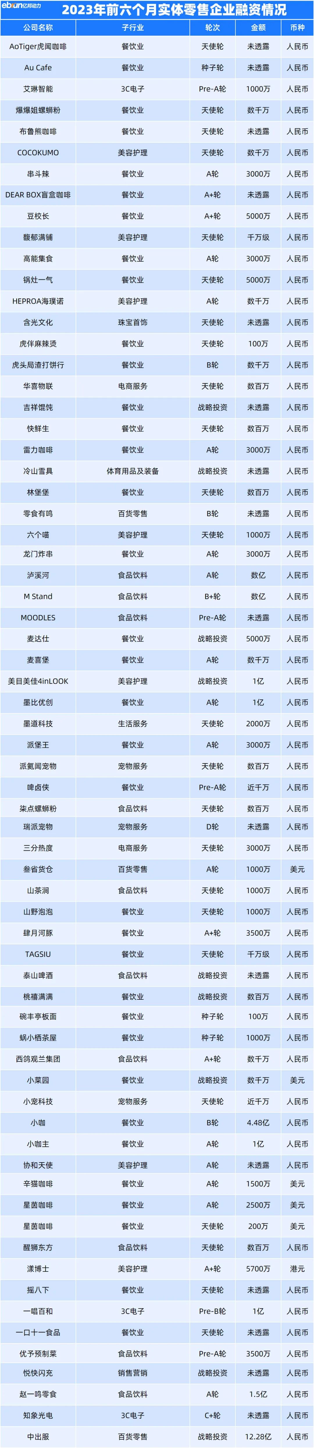 另一边,随着线下消费的复苏与好转,以实体零售企业为主的餐饮企业也受到了投资市场的青睐。在实体零售企业融资事件中,共有45起餐饮相关的融资,约占整个实体零售企业融资数量的67.2%。