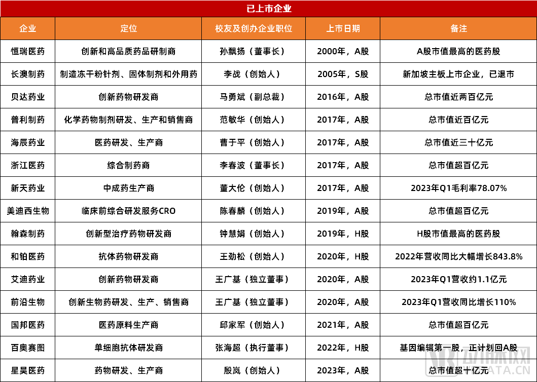 而除了这些等待上市的,像星昊医药这类已上市的药大系医药企业也非常多。据动脉网不完全统计,截止发稿,药大已在生物医药板块收获了15家上市企业,这其中就包括“A股药王”、由药大1978级校友孙飘扬创立的恒瑞医药,以及其妻子钟慧娟创立的翰森医药。值得一提的是,在很长一段时间里,恒瑞医药和翰森医药都分别位列A股和H股医药市值榜第一。