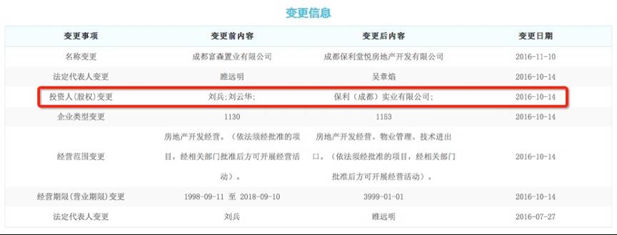 该地块原为成都富森置业有限公司所有,观察员查阅工商资料获悉,10月14日,富森置业投资人股权由刘兵、刘云华变更为保利(成都)实业有限公司;同日,富森置业法定代表人由睢远明变更为吴章焰。