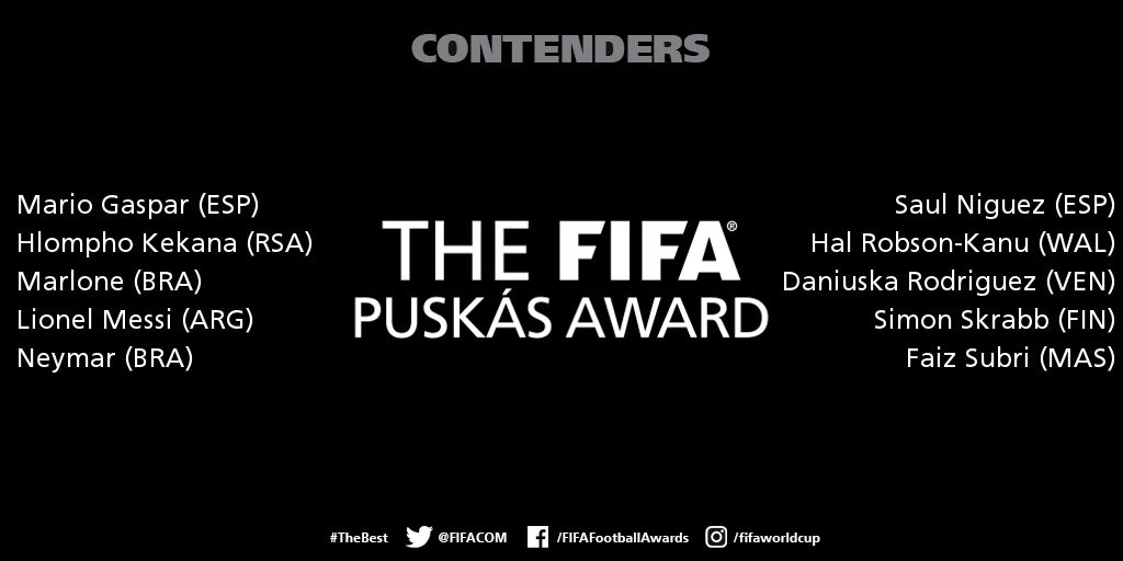 北京时间11月22日晚,国际足联在其官方网站公布了普斯卡什奖(最佳进球奖)十大候选名单。其中,巴萨两大天王梅西和内马尔分别入围,萨乌尔则凭借在欧冠半决赛对阵拜仁慕尼黑的凌波微步跻身榜单。