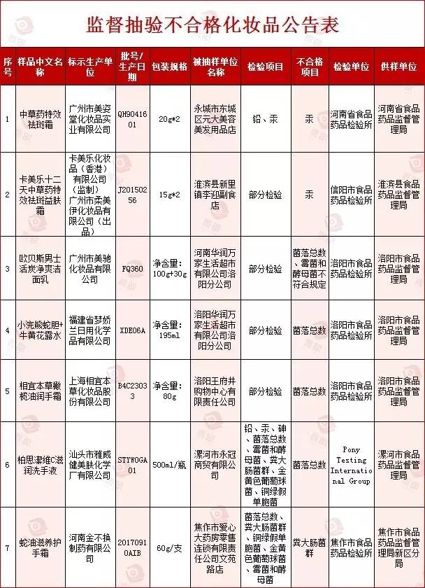 据《河南省化妆品质量公告(总第1期)2016年第122号》显示,标示广州市美姿堂化妆品实业有限公司生产的1批次中草药特效祛斑霜,汞项目不合格;标示卡美乐化妆品(香港)有限公司(监制)、广州市柔美伊化妆品有限公司(出品)的1批次卡美乐十二天中草药特效祛斑益肤霜,汞项目不合格。