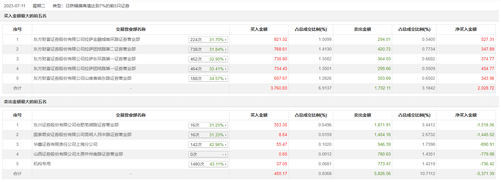 具体来看,机构买入37.05万元,卖出773.47万元,合计净卖出736.42万元。此外,东兴证券合肥芜湖路证券营业部、国泰君安证券昆明人民中路证券营业部分别卖出1871.91万元、1454.16万元;东方财富证券拉萨金融城南环路证券营业部、东方财富证券拉萨团结路第二证券营业部分别买入821.32万元、768.61万元。