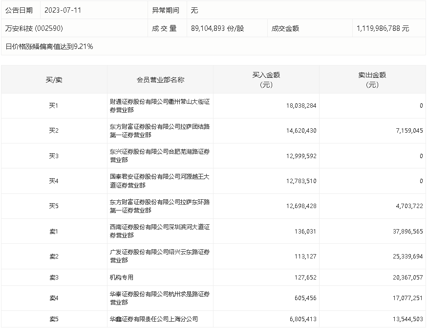 7月11日,万安科技今日涨停,龙虎榜数据显示,上榜营业部席位全天成交2.05亿元,占当日总成交金额比例为18.31%。其中,买入金额为7892.79万元,卖出金额为1.26亿元,合计净卖出4715.99万元。