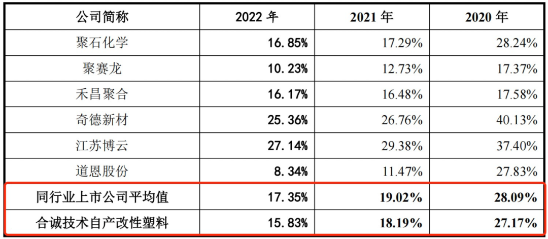 具体从自产产品来看,报告期内,合诚技术自产改性塑料业务的毛利率分别为27.17%、18.19%和15.83%,同行业上市公司毛利率平均值分别为28.09%、19.02%和17.35%,合诚技术毛利率不仅逐渐下滑,且一直低于同行公司水平。