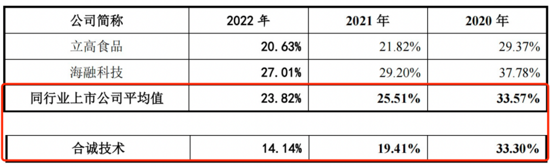 以自产酱料毛利率情况为例,报告期内,公司自产酱料的毛利率分别为33.30%、19.41%和14.14%,2022年,毛利率相对2020年直接“腰斩”,下降了19.16个百分点。而该业务的同行公司立高食品、海融科技的毛利率平均值分别为33.57%、25.51%和23.82%,远高于合诚技术。