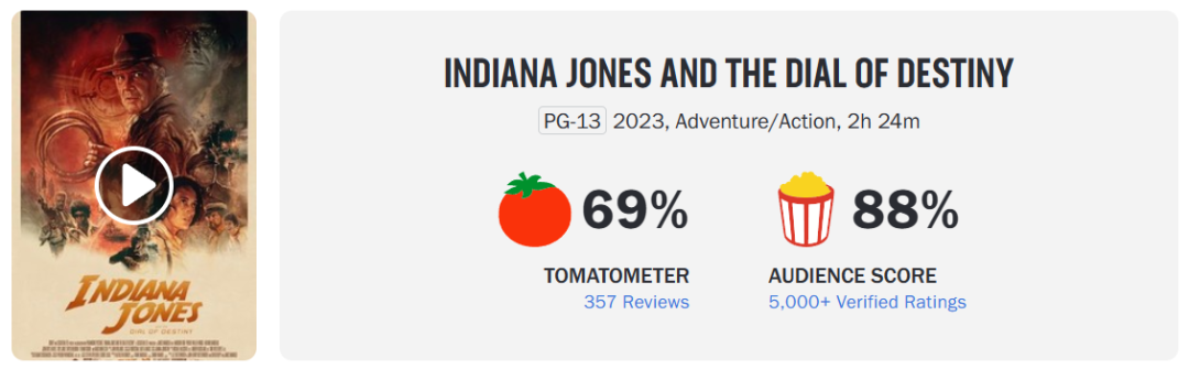 从口碑来看,《夺宝奇兵5》的烂番茄新鲜度为69%,与同属迪士尼的《小美人鱼》(67%)接近,但这一媒体综评分在系列中垫底,影评人认为哈里森·福特的回归提供了“情怀”加成;同时《夺宝奇兵5》的爆米花指数达到88%,显示观众对影片的动作和冒险元素颇为满意。不过《夺宝奇兵5》在IMDb上得到6.9分(4.1万个评价),在近期的新片中并不突出。