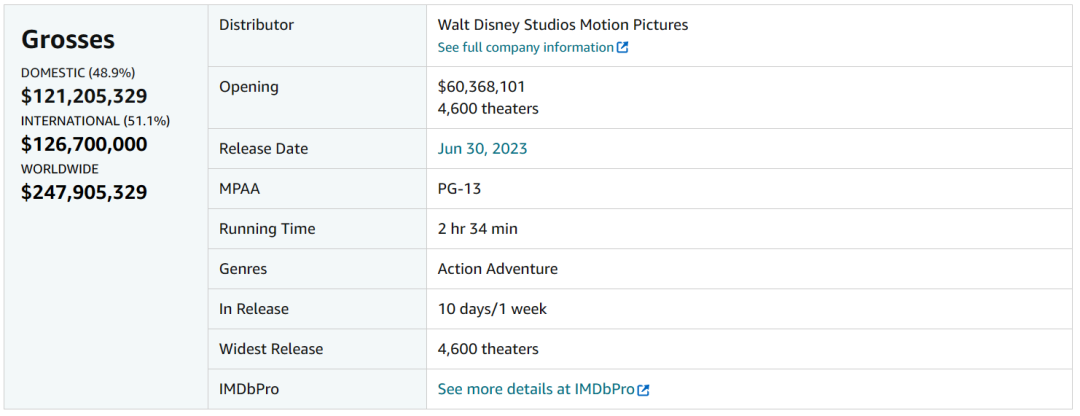 但《夺宝奇兵5》的拍摄预算达到3亿美元之巨,且后续并无更多扩映计划,显见迪士尼收回投资的难度之大。