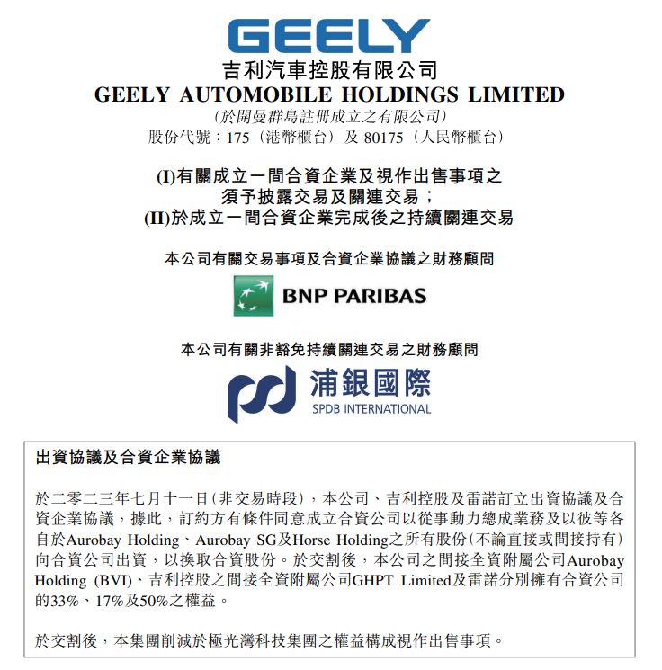 7月11日,吉利汽车控股公司发布公告称,吉利控股集团和吉利汽车控股公司与雷诺集团签署合资协议,成立一家专注于混合动力和燃油动力总成的合资公司。吉利与雷诺各持有合资公司50%的股份。