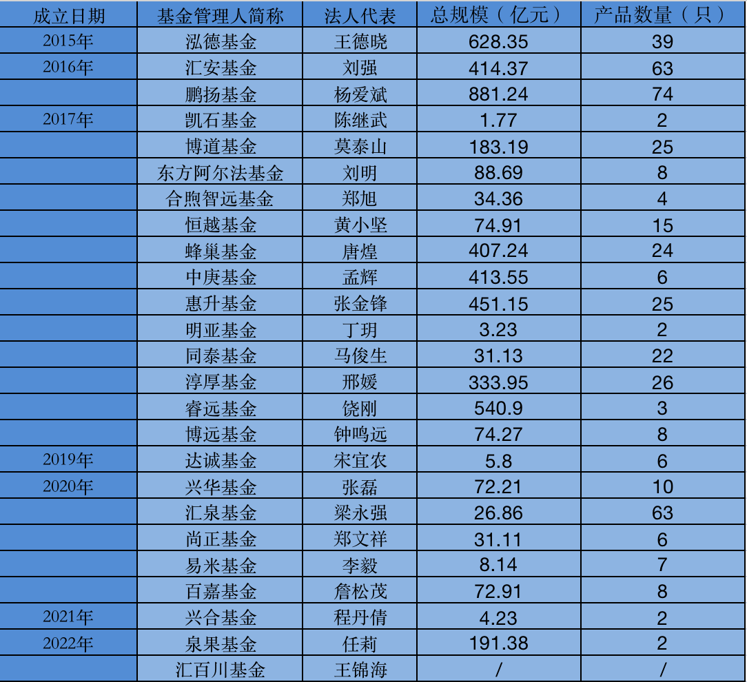 Wind数据显示,25家个人系公募已有24家发行了产品,截至最新,公募管理规模合计4974.94亿元。公募规模500亿元以上的有3家,鹏扬基金总规模第一为881.24亿元;300亿以上的有7家;有9家规模不足50亿,有5家不足10亿。