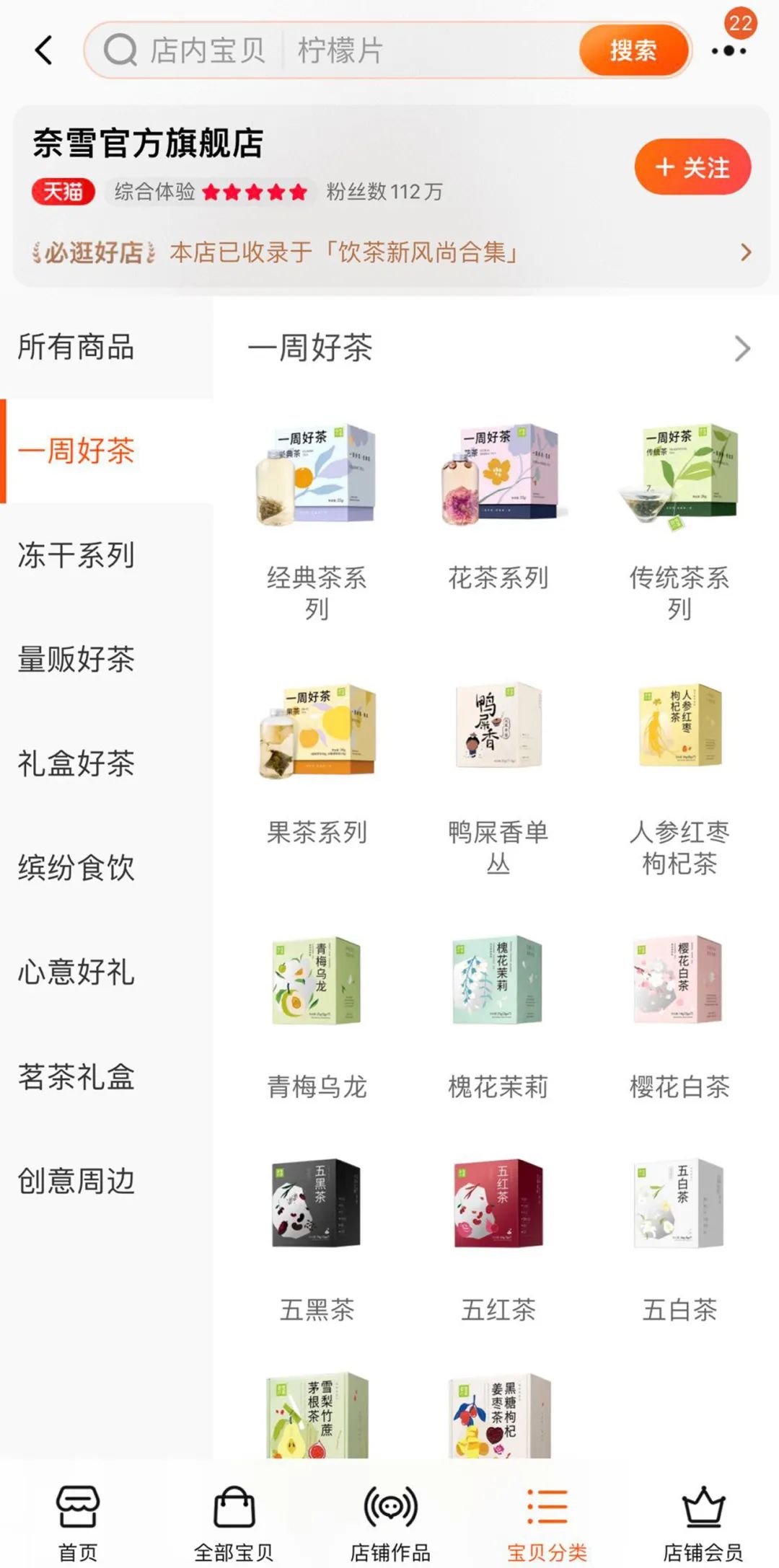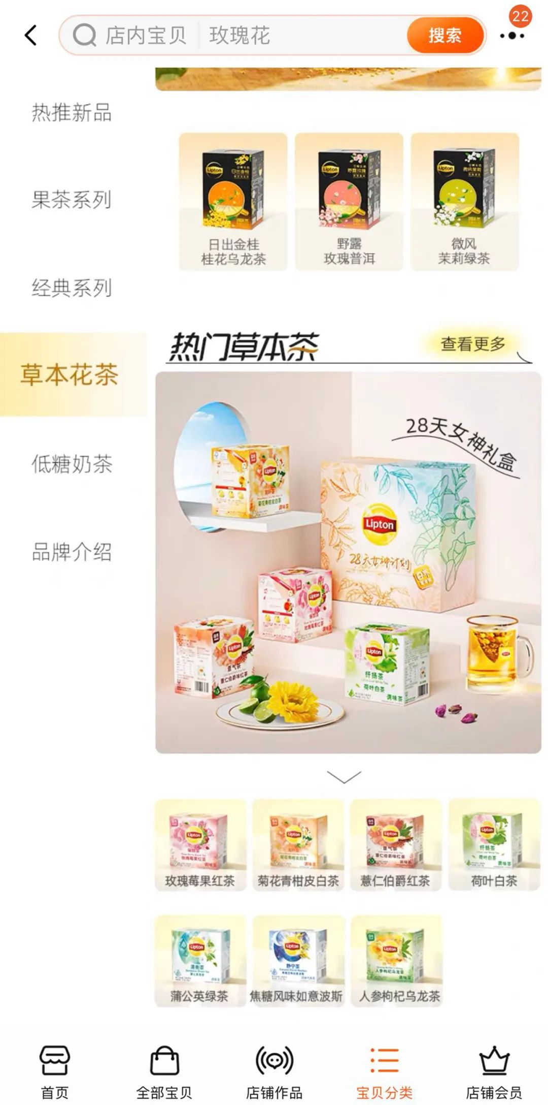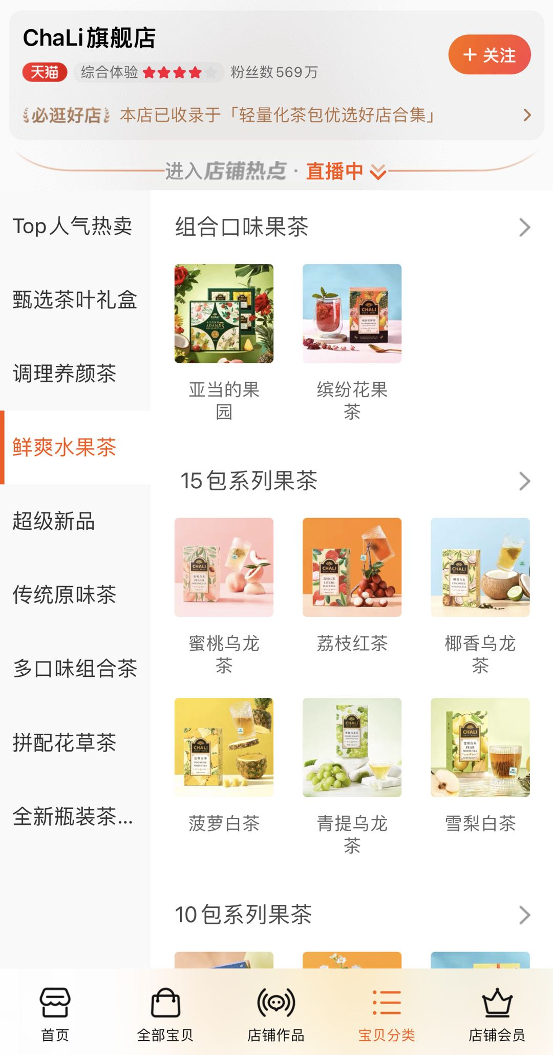 在天猫旗舰店,CHALI将旗下产品分为调理养颜茶、鲜爽水果茶、传统原味茶、超级新品(动干、冷泡茶)、多口味组合茶礼、拼配花草茶以及瓶装茶。
