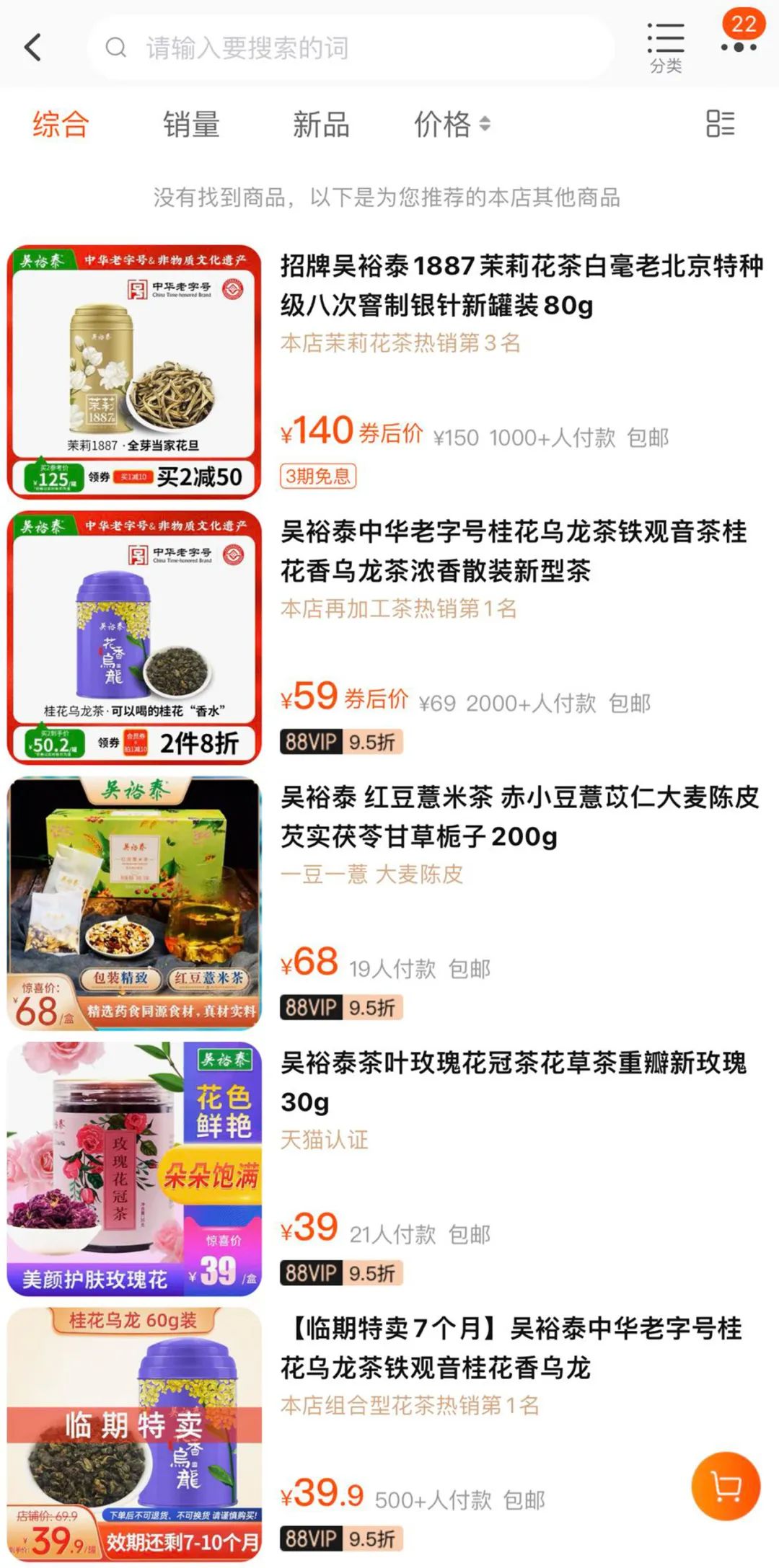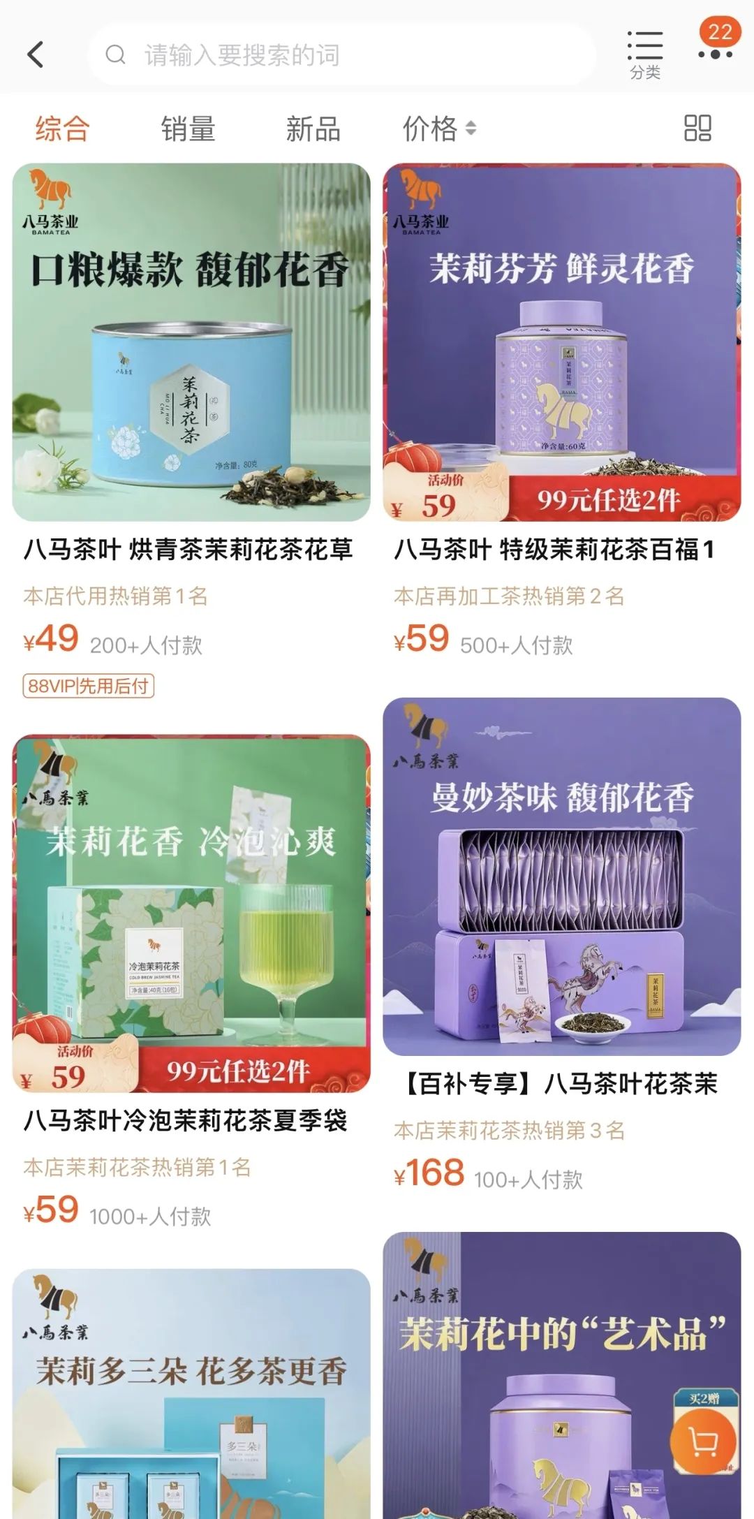 就价格而言,在天猫旗舰店,以CAHLI一盒装茉莉绿茶为例,2g*18包售价59元,平均单包售价为3.28元。作为对比,吴裕泰茉莉花茶5包组合装,单包净含量在50g以上,券后定价为109元,单包定价为21.8元。